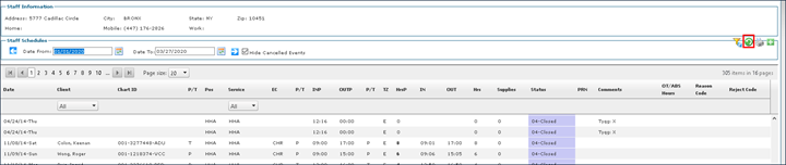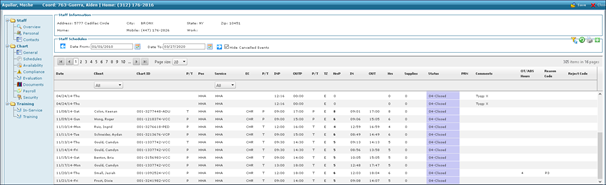 1. Navigate to the Staff Search screen. Main Menu > Staff. 2. Locate and double click on the staff member using the search filters. 3. Click Schedules. |