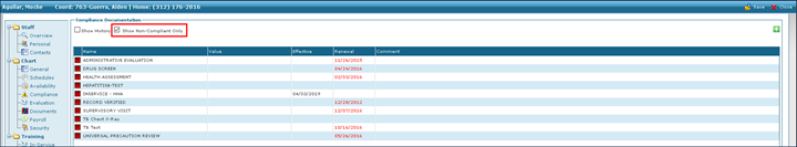 1. Navigate to the Staff Search screen. Main Menu > Staff. 2. Use the filters to locate the staff member. Double click to open the staff profile. 3. Click Compliance. 4. Click Show Non-Compliant Only. This displays only documentation that is out of compliance. |