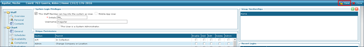 1. Navigate to the Staff Search screen. Main Menu > Staff. 2. Locate and double click on the staff member using the search filters. 3. Click Security. |