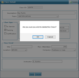 Sandata Technologies Product Help Sandata Agency Management Staff Staff Training Removing a Class To delete a class: 1. Navigate to the Class Master screen. Main Menu > Staff > Training > ClassMaster. 2. Locate the class. 3. Double click on the class. 4. Click Delete. A prompt asking for confirmation displays. 5. Click Ok. Zendesk Designer.5.log-1117815581.zip10 KB Comments 0 comments Please sign in to leave a comment.