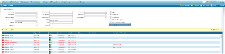 1. Navigate to the Staff Search screen. Main Menu > Staff. 2. Locate and double click on the staff member using the search filters. |