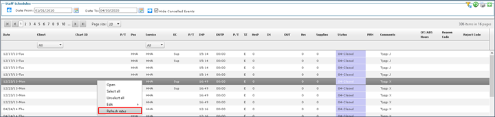 4. Use the filters to locate the date range of the schedule. 5. Right click on the schedule and click Refresh Rates. This opens the Schedule Updater window while the rates are refreshed. |