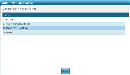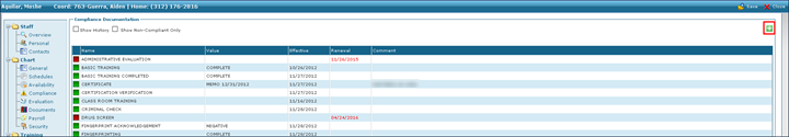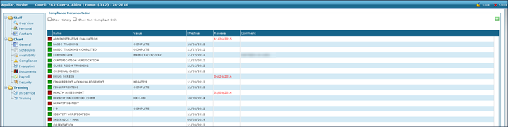 1. Navigate to the Staff Search screen. Main Menu > Staff. 2. Use the filters to locate the staff member. Double click to open the staff profile. 3. Click Compliance. |