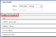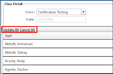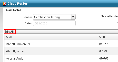 1. Navigate to the ClassRoster screen. Main Menu > Staff > Training > Class Roster. 2. Select the class from the Class drop down. |
