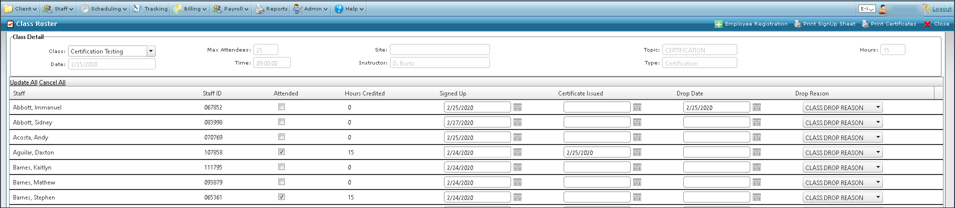 The Class Roster screen allows users to manage the day to day activities of running a single or long-term class. From the Class Roster screen, users can take attendance, drop staff members from a course and confirm credit hours received.