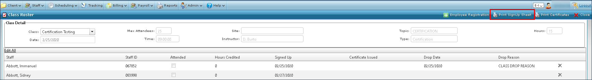 1. Navigate to the Class Roster screen. Main Menu > Staff > Training > Class Roster. 2. Select the class from the Class drop down. |