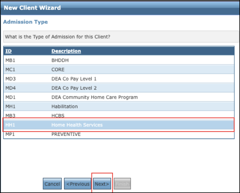 5. Select the HH1 Home Health Services Admission Type for the client.