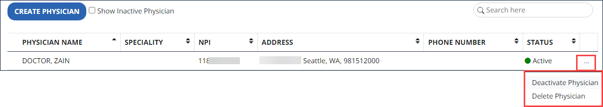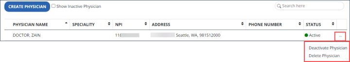 In Physician Management, you can select their name in the list of Physicians to edit their information at any time. Use the options menu on the right to deactivate or delete.