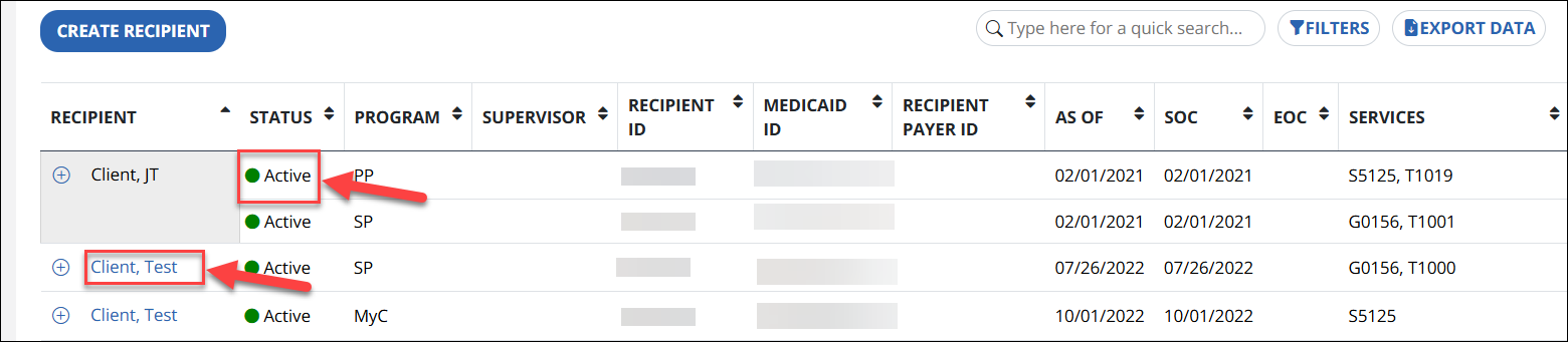 - Select the Recipient by clicking on the name or, if multiple programs, click on the status of the Recipient’s program to view the Recipient’s profile. Do not select the plus sign to open the profile.