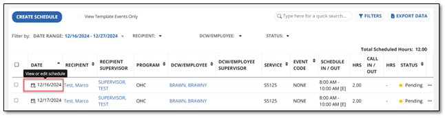 - From the Scheduling module, you will see a list of all scheduled events. You can select one from the list or start by selecting the date range to filter by date. You can also filter by Recipient, DCW/Employee or Status.