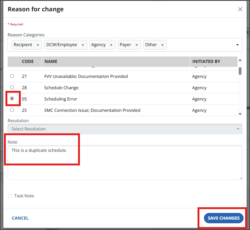 4. Select the reason for the change and enter the optional note. Then select Save Changes.