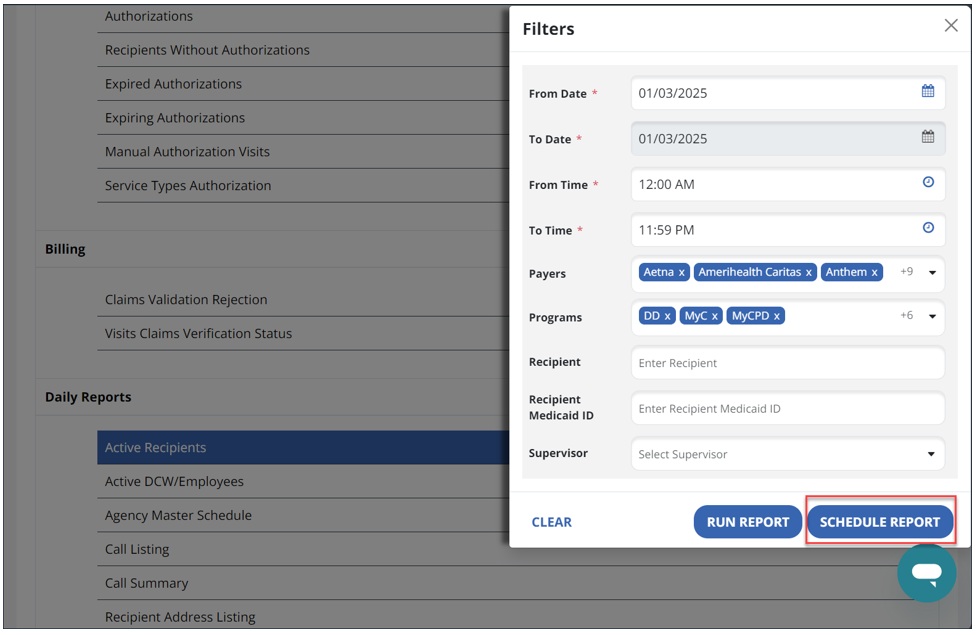 Enter filters for the report, including the timeframe. Select Schedule Report.