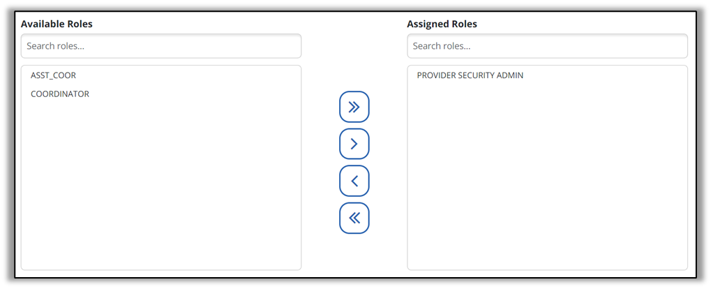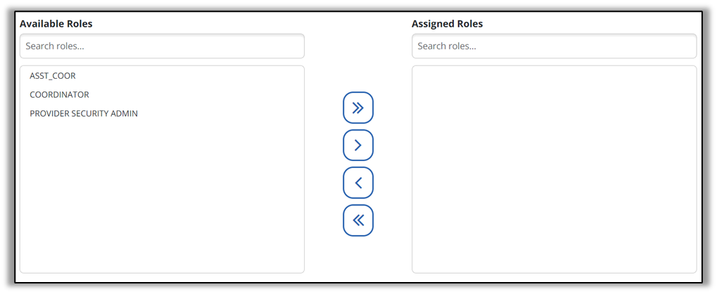 4. Select the appropriate item in the available roles field and select the > button to move it into the assigned roles field. All user privileges assigned to the roles selected are granted to the user. Multiple roles can be assigned if needed.