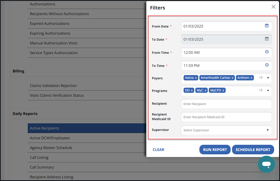 - In the Filters window, enter info in the fields to provide specific reporting data. Enter any additional filters for the report such as a Recipient, Program, or DCW/Employee. Each report has its own set of filters. Using filters will limit the report to matching results.