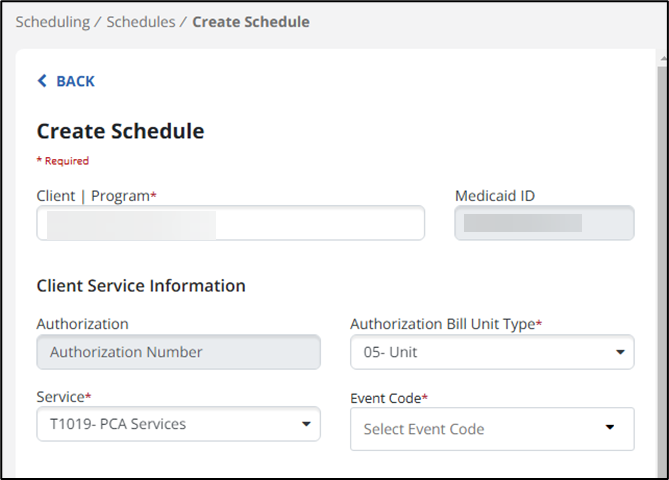 2. Once you start typing a client’s name in the Client field, you can select that client and see their service and authorization information.  Select a Bill Unit Type, Service and Event Code (required fields).