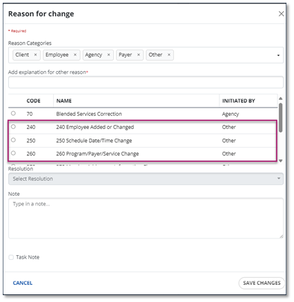 You’ll also notice other reason codes that are formatted differently. These are standard Sandata EVV codes and do not require your attention. Here’s a tip: look for the reason codes with the Code number included in the Name. Those are the codes you'll want to use.