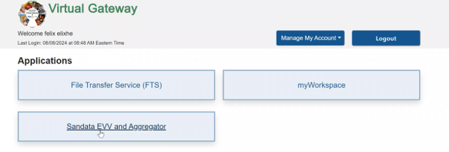 9. Once setup is complete, users will be able to log in and access the Applications page to select Sandata EVV and Aggregator. Both providers using the State-sponsored EVV solution and those using an Alt-EVV vendor will use this tile to access Sandata EVV or Aggregator.