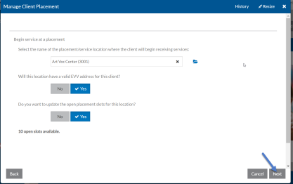 In this field: Enter this information: Select the name of the placement/service location where the client will begin receiving services The placement or service location where the client will begin receiving services. The placement must be tied to a global location to appear in this list. Will this location have a valid EVV address for this client? This question will appear if the Client has the Use EVV check box selected. Select Yes if you want to mark this new location to Sync to DataPlus as an EVV address for this client. You will also need to work with Sandata to turn on this sync if it is not already set up for you. Do you want to update the open placement slofts for this location? Select yes if this Placement has Placement Slots set up for it. The Open Slot count will be reduced by one. Answer the following questions to update the client's billing defaults and data collection plans if needed and click Next.