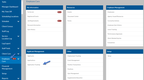 Select Employee Care from the menu and then select Application Tracking from the Applicant Management card.
