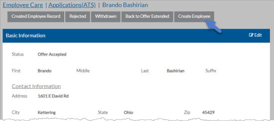 If you have decided to hire an applicant and the Application is in the “Offer Accepted” status, you can automatically copy the information from the applicant profile to create an employee profile.