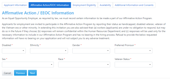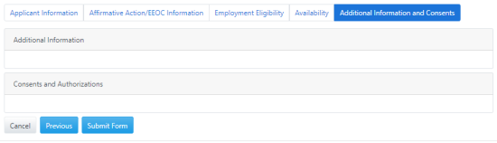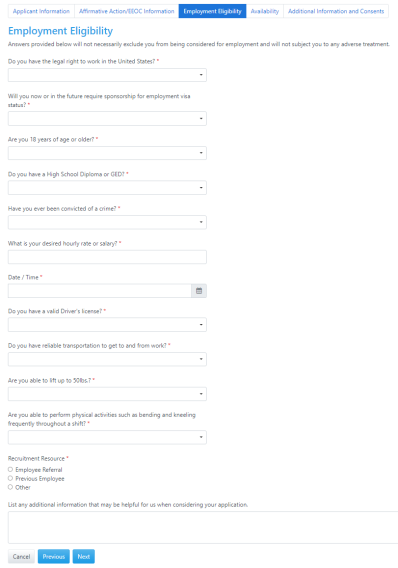 During the implementation process you will have the opportunity to make some minor customizations to the standard application template such as adding your company logo and modifying the questions that appear on the Additional Information and Consents page of the web application. The images below show an example of the web application. You will be given the web address to your company’s version of the web application during implementation that you can then link to from your company website or any other job listing.