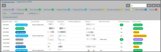 Once the applicant completes and submits the application it automatically appears as a new application within Employee Care . The Applications (ATS) screen lists all applications submitted using the link to the external form. From here you can search for, filter, or print a list of all applications, and add an applicant manually, if necessary. The columns and data on these screens can be customized and reordered using the configuration button. Click on an application to view the information entered on the form, share the applicant’s record internally and manage interviewer information.