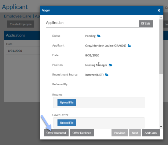 If your agency has decided to hire an applicant, you can automatically copy the information from the applicant to create an employee.