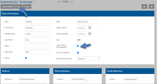 Note: Make sure you select Use Position Management, if you want to run the Employment Tracking Wizard or use Basic Position Tracking for this employee.