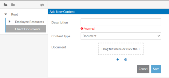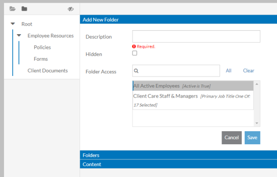 Description The name of the folder Hidden Select if the folder should not appear to users Folder Access Select the Document Access filters of the employees who should have access to the contents of the folder. If the folder has subfolder and folder access is not set for it the users will have access to its contents as well. Select the + next to Contents to add a new document or link and complete the information below.