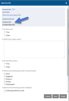 When you are ready, answer the questions. If you are interrupted or need more time you can click Save and come back and finish the quiz later. Otherwise, select Grade to auto-score the quiz in real time.