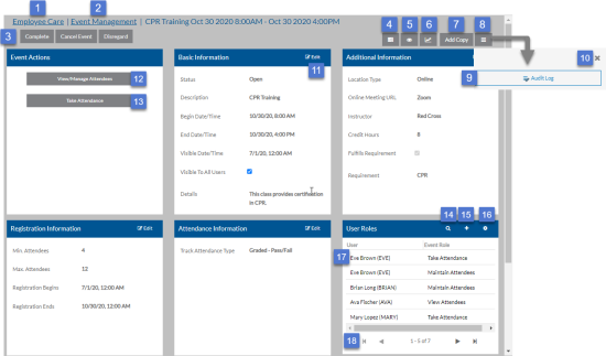 - Event Role: View Attendees, Maintain Attendees (add and remove), Take Attendance.