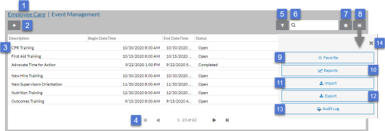 6 Search for an event. 7 Add, remove and reorder columns in the grid. 8 Open the Options tray to view additional functions. 9 Add or remove the Event Management grid from your Favorites menu. 10 Run a report. 11 Import events from MS Excel. 12 Export events to MS Excel. 13 View the audit history. 14 Close the Options tray. You may see a message similar to the one below. This message means additional events match your filter settings, but there are too many to show. If this happens you either need to adjust your filters or use the search to find the one you are looking for.