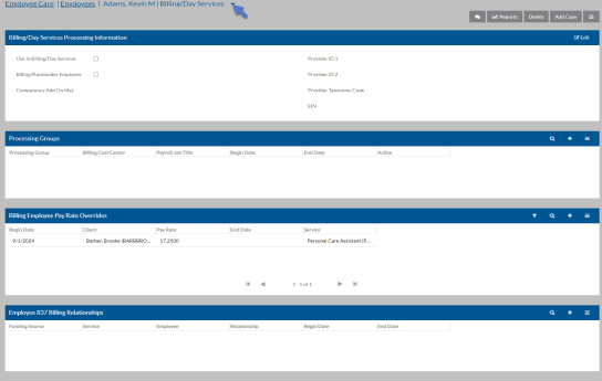 | Employee 837 Billing Relationships | If a funding source requires an employee’s relationship with a client to be included in 2300 loop of the 837 file for a particular service and this employee has a relationship other than the default employee relationship set in the funding source service type with a client(s), you will need to define the relationships. Complete this information: Client - The code of the Client that this employee will be serving. Only clients that have “Use in Billing/Day Services” selected will appear. Funding Source: The code of the Funding Source that requires the employee relationship to appear in the 837 file. Only funding sources that have at least one Billing Service Type with Employee Relationship Required selected appear. Service - The Billing Service Types that the employee is providing the client that requires the relationship to appear in the 837 file. Only billing services that a set up under the selected Funding Source with Employee Relationship Required selected appear. Relationship -The relationship the selected employee has to the client. The options that appear come from the relationships set up in the selected Funding Source Billing Service Type that are NOT marked as the Default . Begin Date - What Service Date to begin considering this relationship (Prior to this date, it will either use the another Relationship record or the Default relationship if another Relationship is not entered). End Date - The final Service Date for this relationship (optional) (After this date, it will either use the another Relationship record or the Default relationship if another Relationship is not entered).