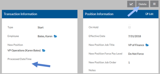 The Position Transaction will open. The information cannot be modified. However, if the Processed Date/Time is blank, you can delete the Position Transaction to cancel vacating the position.