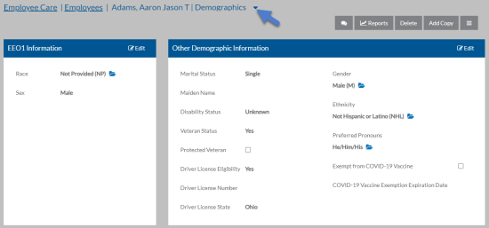You will find demographic information about the employee on the Demographics tab: