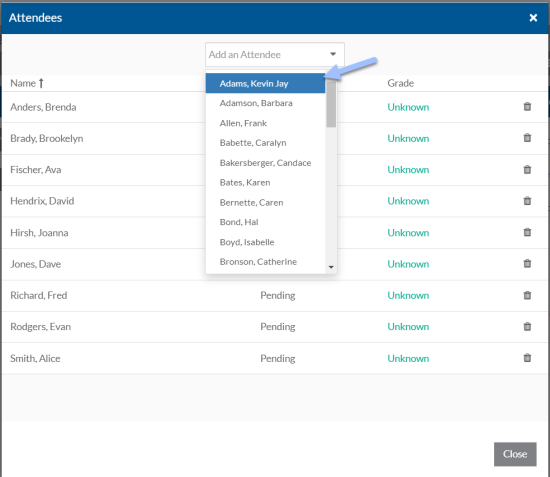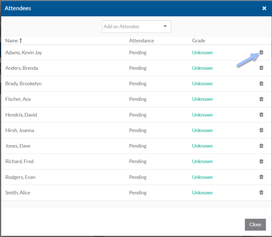 If you have the correct user role for an event, you can you can view, add or delete attendees: