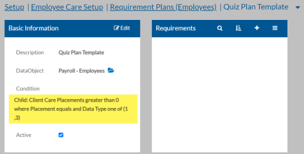 Employee Requirement Plan - If you decide to auto-generate requirement plans from the quiz, you will need to create a requirement plan to use as the template to generate them from. The requirement plan should not have any requirements assigned to it and have the filter set up as follows: