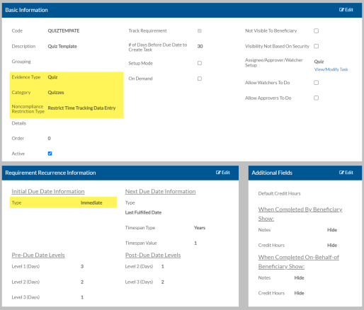 Quiz Settings - This is a one-time setup item where you turn on the settings to auto-generate requirements and/or requirement plans and select the requirement plan template.