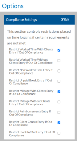Time Tracking Options - Scroll down to the bottom of Time Tracking Options to find the Compliance Settings card. From here you will select which types of Time Tracking transactions you want staff with a Staff Permission Group set to Restrict Data Entry if Out of Compliance to be locked out of if the have not completed a requirement with a Noncompliance Restriction Type set to Restrict Time Tracking Data Entry. The types related to clients are Worked Time with Clients Entry, Mileage With Clients Entry and Client Census Entry,