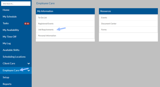 Select Employee Care from the main menu and then select Job Requirements from the My Information card.