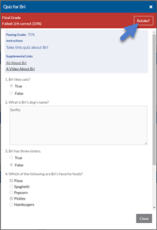 If you pass the quiz (based on the passing percentage set in the quiz setup), yourequirement will be marked fulfilled and the you will be in compliance for Time Tracking. If you fail the quiz, the requirement will remain unfilled and you will remain out of compliance for Time Tracking until you pass the quiz. You can click Retake? at the top of the card at any time to try again.