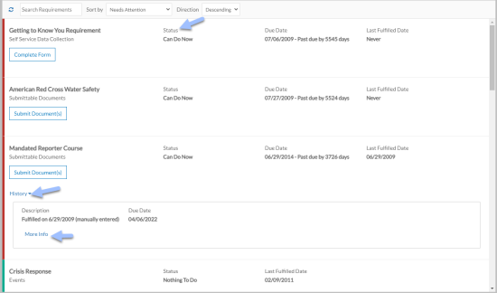 If the Status is Nothing To Do, then the Requirement is not due yet. If the Status is Not Required, then you are no longer required to complete this requirement although at some point in the past you were. You can click on the History link to view when you complete the requirement in the past and select the More Info link to view additional information about what you submitted to complete the requirement.