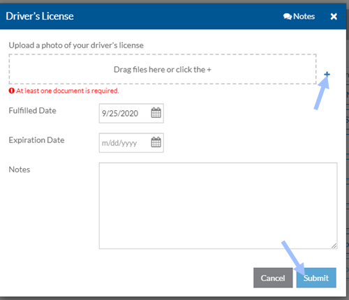 Drag the file into the window or click the + to browse for it, enter the fulfilled date, expiration date, credit hours and/or any notes as required and click Submit.
