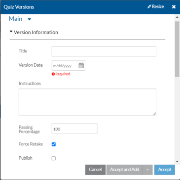 In this field: Enter or Select: Title A brief description of the quiz topic Version Date The date this version of the quiz is in effect. Instructions Any instructions or details that you want to appear to the employee taking the quiz. Passing Percentage The percentage of the questions the employee must get correct in order to pass the quiz and have the associated requirement marked complete. Force Retake If this is the first version of the quiz leave Force Retake selected. Otherwise, select Force Retake to make all employee required to take this quiz re-take the quiz immediately. If not selected, employees will take the new quiz the next time the quiz is scheduled to take or re-take based on the last time they completed it (if they have taken it previously) and the requirement’s settings.