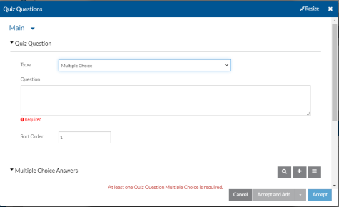 Question The quiz question that the employee will see. Answer Is True If the Type is True or False, select if the answer to the question is True. Correct Answer If the Type is Text Value, enter the correct answer. Sort Order A number to indicate the order the question should appear in the quiz. You can use the Adjust Order option found under the Options menu of the Quiz Questions card to reorder the questions later.