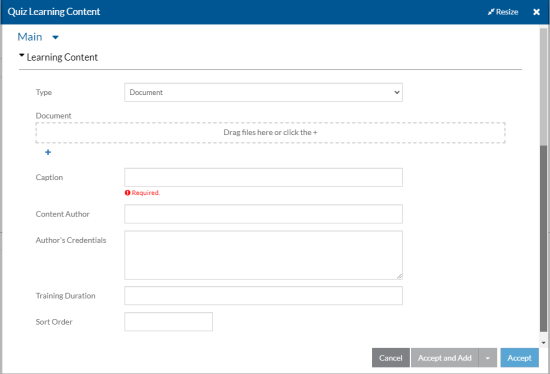 In this field: Select or Enter: Type Document or External (web address). Document If Type is Document, drag the document into the dotted square or select the + to browse for and select the document with the learning content for this quiz. Website If Type is External, enter the website address to the video or other learning content for this quiz. Caption The caption to appear next to the document or web link. Content Author The creator, author or trainer of the learning content document or link. Author’s Credentials The credentials of the author who created or presented the learning content. Training Duration The amount of time it will take the user to read or view the learning content. Sort Order A number to indicate the order the learning content should appear at the top of the quiz. You can use the Adjust Order option found under the Options menu of the Learning Content card to reorder the items later.