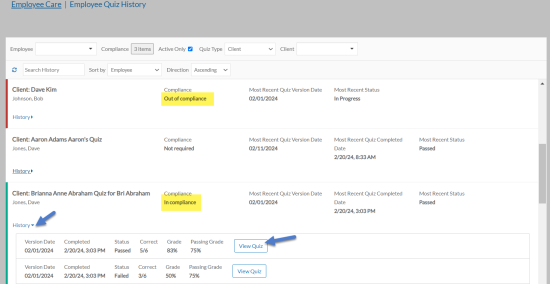 Select the caret next to History to see the results and then click View Quiz to see the employee’s responses along with the correct answers.
