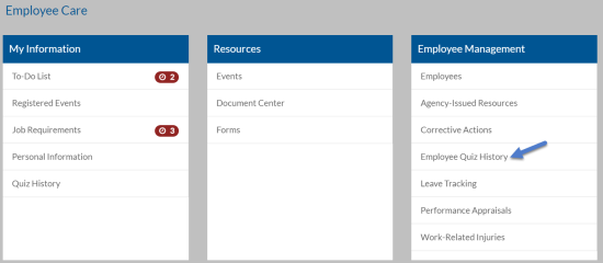 Select Employee Care from the main menu and then select Employee Quiz History from the Employee Management card.