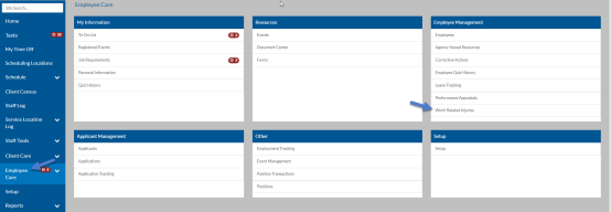 To manage the work-related injuries for multiple employees, select Employee Care from the menu and then select Work-related Injuries from theEmployee Management card.