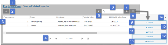 6 Search for a work-related injury. 7 Add, remove and reorder columns in the grid. 8 Open the Options tray to view additional functions. 9 Add or remove the Work-Related Injuries grid from your Favorites menu. 10 Run a report. 11 Import work-related injuries from MS Excel. 12 Export work-related injuries to MS Excel. 13 View the audit history. 14 Close the Options tray. You may see a message similar to the one below. This message means additional work-related injuries match your filter settings, but there are too many to show. If this happens you either need to adjust your filters or use the search to find the one you are looking for.